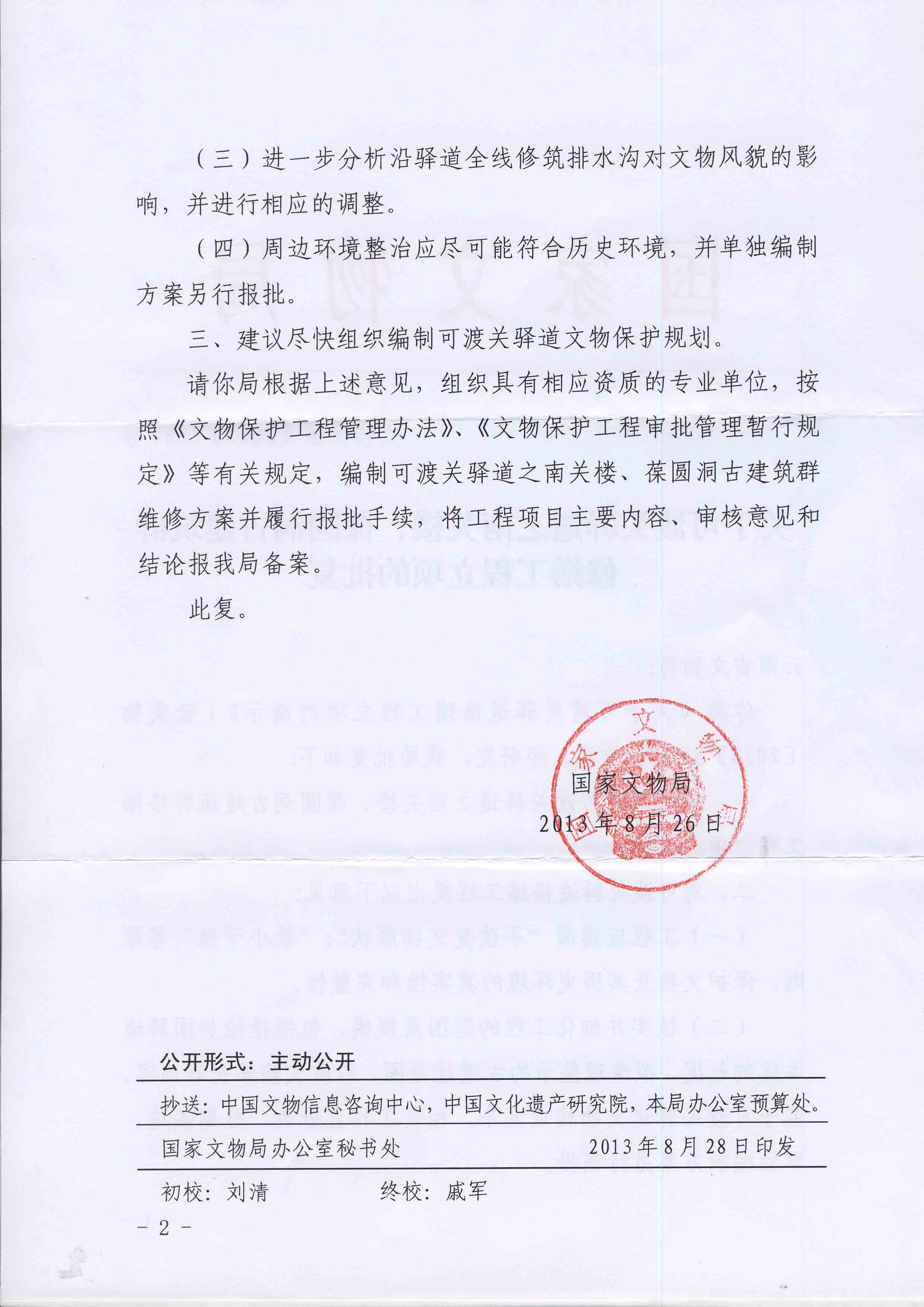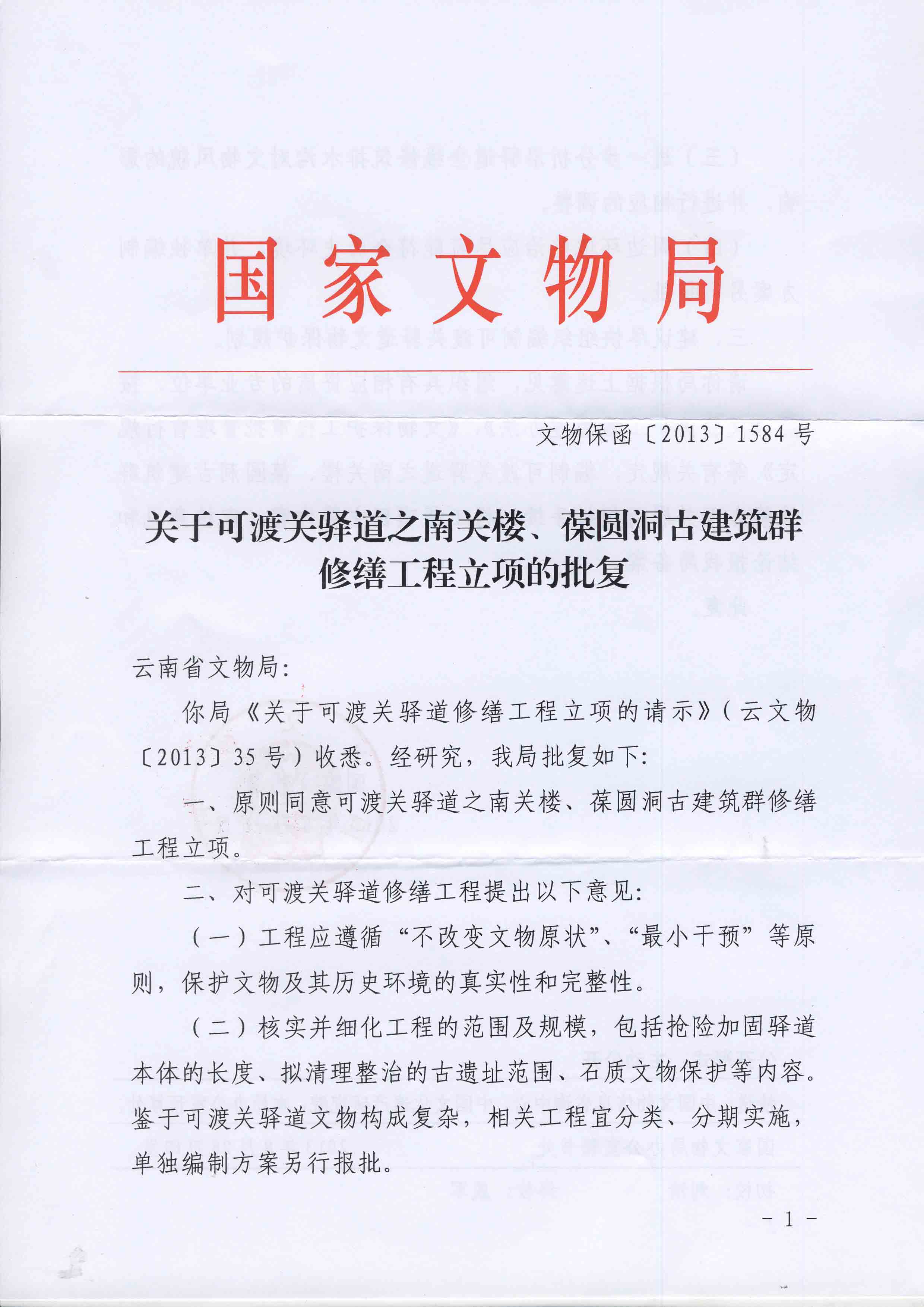 国家文物局关于可渡关驿道之南关楼、葆圆洞古建筑群修缮立项工程的批复